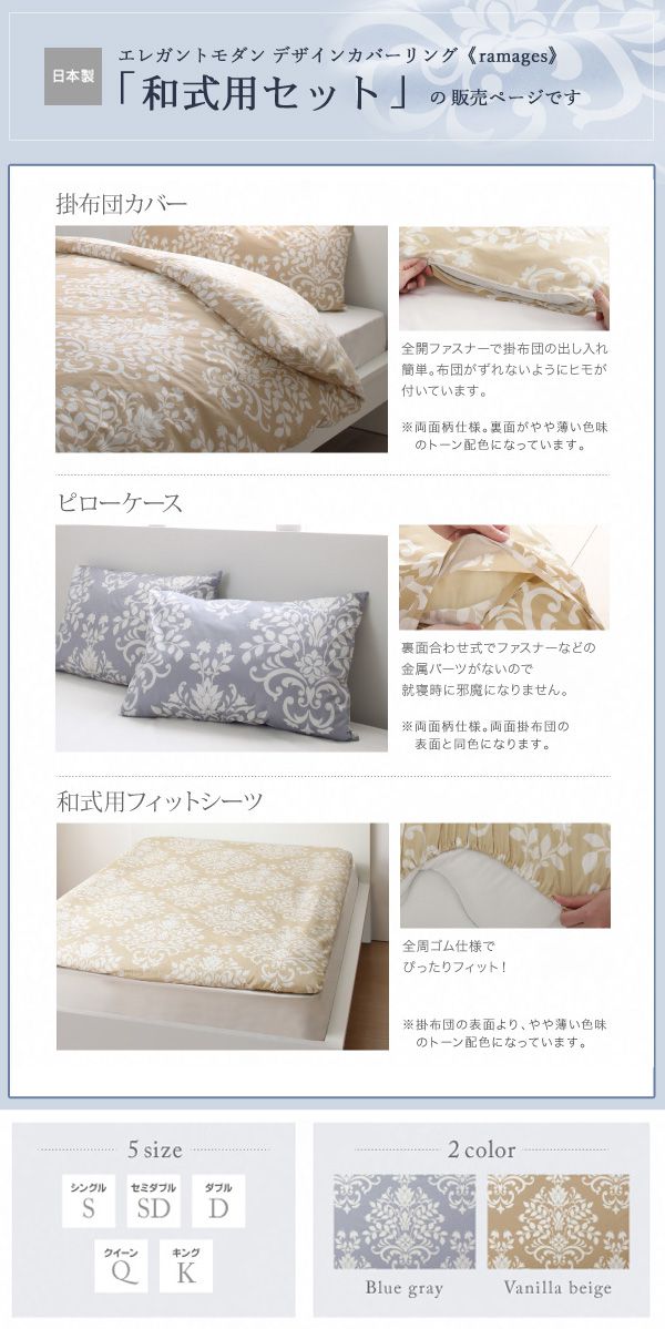 -サイズ- (ダブルサイズ) 掛け布団カバー:約190×210cm 敷布団カバー:約140×210cm+厚みマチ20cm 枕カバー:約43×63cm -材質- 側地:綿100% -仕様- 色:ブルーグレー、バニラベージュ セット内容:掛け布団カバー×1、敷布団カバー×1、枕カバー×2 洗濯機洗いOK 日本製 -配送- 玄関先お届け -お届けの目安- 2営業日後出荷/3-4日後お届け ※土日祝日は定休日 -配達日時指定- 指定可 -配送に関するご注意- 沖縄、離島への配送はできませんエレガントデザインカバーリング ramages/ラマージュ 日本製 綿100% サイズバリエーション ・敷布団用布団カバー3点セット シングル セミダブル ダブル シリーズ一覧 掛け布団カバー ボックスシーツ 敷布団カバー ピローケース ベッド用3点セット