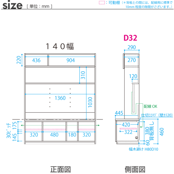 材質 プリント紙化粧合板、MDF(中密度繊維板) サイズ 幅140×奥行32×高さ180cm 備考 完成品(日本製 すえ木工) 本体は上置きなしでも使用可能ですが天井突っ張りはできません。