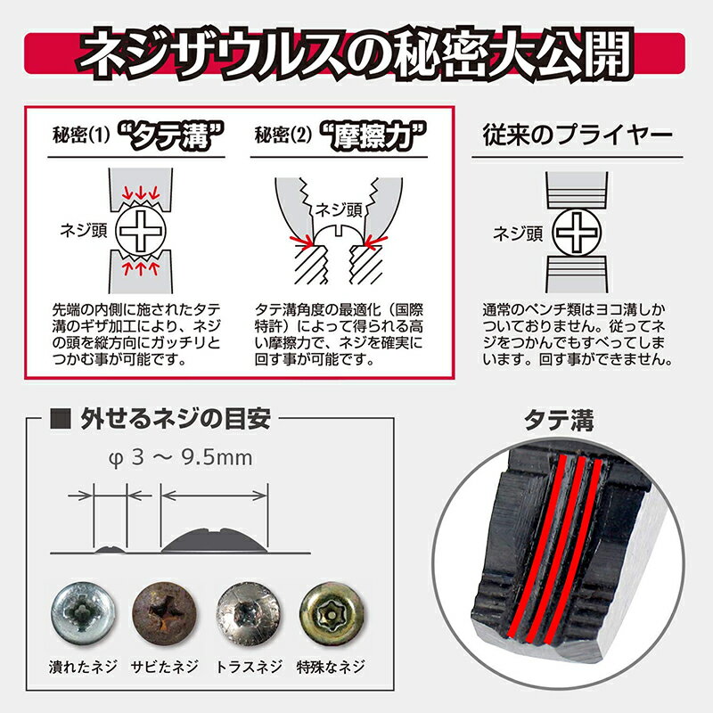 対応ネジサイズ:Φ3〜9.5mm タテ溝硬度:HRC58±2 切断能力:銅線Φ1.2mm 全長:160mm 先端長さ:28mm グリップ幅:54mm 重量:130g 材質:本体/高炭素鋼、グリップ/エラストマー ※タッピングネジ、ドリリングネジ、コーススレッドなどの硬度が高いネジや、接着剤や錆で完全に固着したネジには使用しないでください。