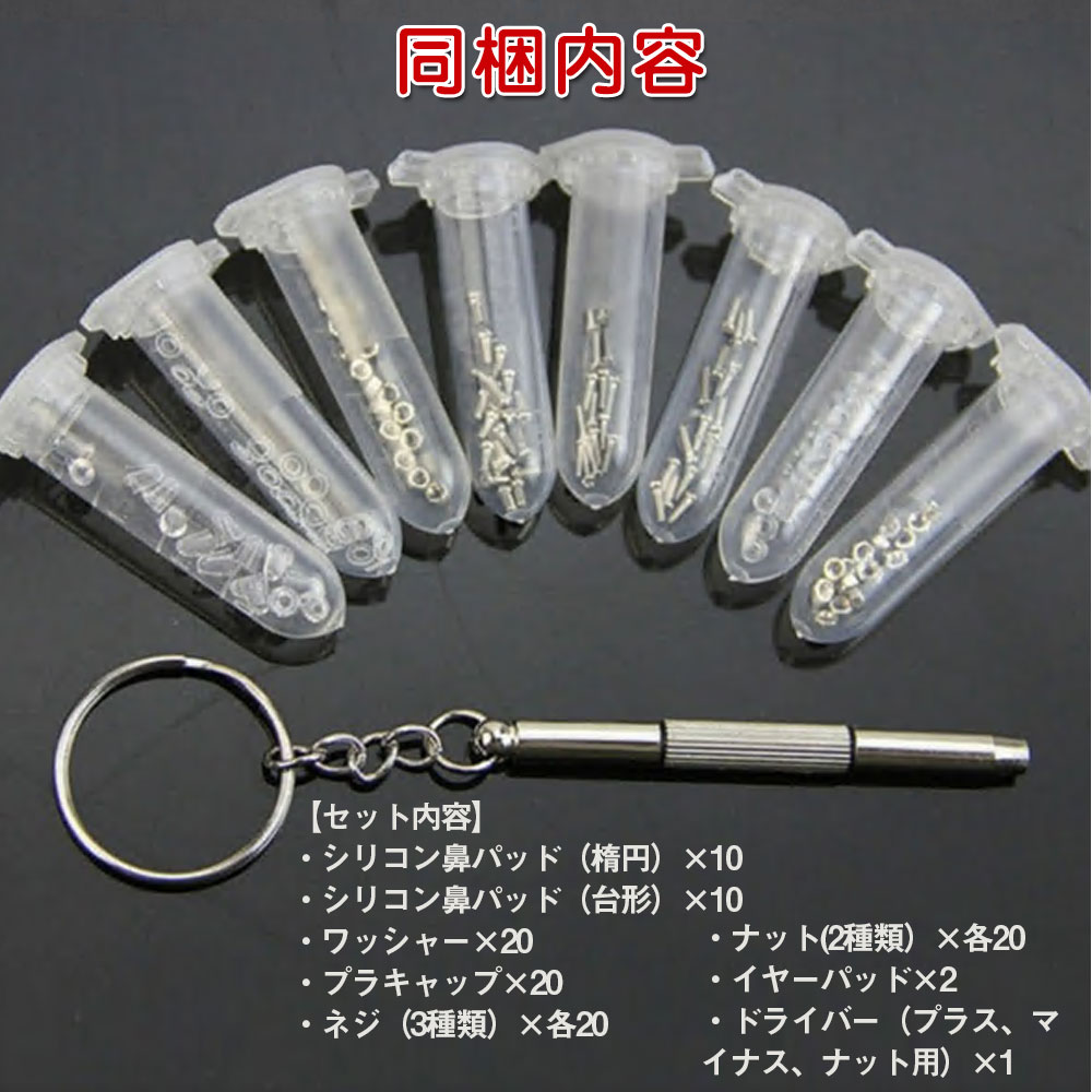 【セット内容】 ・シリコン鼻パッド(楕円)×10 ・シリコン鼻パッド(台形)×10 ・ワッシャー×20 ・プラキャップ×20 ・ネジ(4種類)×各20 ・ナット×20 ・イヤーパッド×2 ・ドライバー(プラス、マイナス、ナット用)×1 【サイズ】 約13×7×2.2cm ※携帯や保管に便利な収納ケース付き 【アフターサービス】 商品の品質向上に常に努めてまいりますが、万が一商品に不具合等がみられた場合は、注文履歴からお気軽に弊店にご連絡ください。