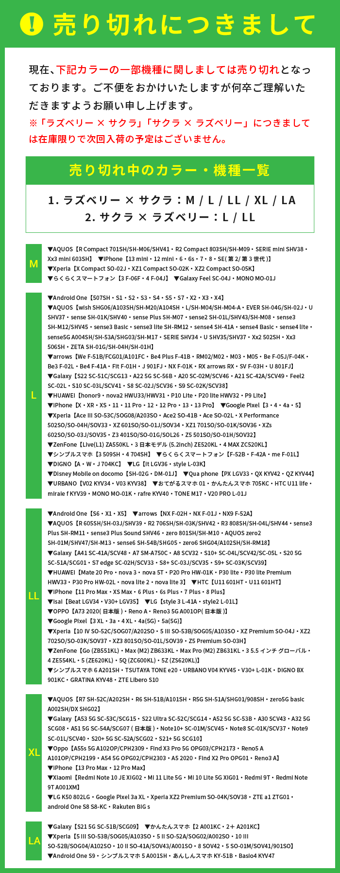 対応機種一覧 ・Apple(アップル)iPhone SE3(第3世代), iPhone13 mini, iPhone13, iPhone13 Pro, iPhone13 Pro Max, iPhone12 mini, iPhone12, iPhone12 Pro, iPhone12 Pro Max, iPhone SE2(第2世代), iPhone11, iPhone11 Pro, iPhone11 Pro Max, iPhone XS, iPhone XS Max, iPhone XR, iPhone X,iPhone8 Plus,iPhone8,iPhone7 Plus,iPhone7,iPhone6s Plus,iPhone6s,iPhone6 Plus(5.5inch),iPhone6(4.7inch),iPhone5S/5,iPhoneSE(第1世代),iPhone5C,iPod touch 7,iPod touch 6,iPod touch 5 ・docomo(ドコモ)AQUOS R7 SH-52C, Galaxy A53 5G SC-53C, AQUOS wish2 SH-51C, Xperia Ace III SO-53C, Xperia 10 IV SO-52C, Xperia 1 IV SO-51C, あんしんスマホ KY-51B, Galaxy S22 Ultra SC-52C, Galaxy S22 SC-51C, らくらくスマートフォン F-52B, arrows We F-51B, Galaxy A22 5G SC-56B, Xperia 5 III SO-53B, AQUOS sense6 SH-54B, arrows Be4 Plus F-41B, AQUOS R6 SH-51B, Xperia Ace2 SO-41B, Galaxy A52 5G SC-53B, Xperia 10 III SO-52B, Xperia 1 III SO-51B, Galaxy S21 Ultra 5G SC-52B, Galaxy S21 5G SC-51B, AQUOS sense5G SH-53A, arrows NX9 F-52A, Galaxy A51 5G SC-54A (日本版), AQUOS sense4 SH-41A, Galaxy A21 SC-42A, LG style3 L-41A, Galaxy Note20 Ultra 5G SC-53A, Xperia 5 II SO-52A, らくらくスマートフォン F-42A, arrows 5G F-51A, arrows Be4 F-41A, Galaxy A41 SC-41A, Galaxy S20+ 5G SC-52A, Xperia 10 II SO-41A, Xperia 1 II SO-51A, HUAWEI P30 Pro HW-02L, Galaxy S20 5G SC-51A, AQUOS R5G SH-51A, AQUOS zero2 SH-01M, Galaxy A20 SC-02M, Galaxy Note10+ SC-01M, Xperia 5 SO-01M, AQUOS sense3 SH-02M, LG style2 L-01L, Xperia 1 SO-03L, Google Pixel 3a, Google Pixel 3a XL, Xperia Ace SO-02L, arrows Be3 F-02L, AQUOS R3 SH-04L, Galaxy S10 SC-03L, Galaxy S10+ SC-04L, Galaxy S10+ Olympic Games Edition SC-05L, らくらくスマートフォン me F-01L, AQUOS sense2 SH-01L, Galaxy Feel2 SC-02L, Google Pixel 3, Google Pixel 3 XL, Xperia XZ3 SO-01L, Xperia XZ2 Premium SO-04K, LG style L-03K, HUAWEI P20 Pro HW-01K, AQUOS R2 SH-03K, arrows Be F-04K, Xperia XZ2 SO-03K, Xperia XZ2 Compact SO-05K, Galaxy S9 SC-02K, Galaxy S9+ SC-03K, V30+ L-01K, Xperia XZ1 SO-01K,Xperia XZ1 Compact SO-02K,AQUOS sense SH-01K,arrows NX F-01K,MONO MO-01K,arrows Be F-05J,AQUOS R SH-03J,Galaxy Feel SC-04J,Galaxy S8+ SC-03J,Galaxy S8 SC-02J,arrows NX F-01J,MONO MO-01J,V20 PRO L-01J,らくらくスマートフォン4 F-04J,Xperia X Compact SO-02J,AQUOS EVER SH-02J,Disney Mobile on docomo DM-01J,Xperia XZ SO-01J,Galaxy S7 edge SC-02H,Xperia X Performance SO-04H,Disney Mobile on docomo DM-01H,AQUOS Compact SH-02H,arrows SV F-03H,arrows NX F-02H,arrows Fit F-01H,AQUOS ZETA SH-04H,Xperia Z5 Premium SO-03H,Xperia Z5 Compact SO-02H,Xperia Z5 SO-01H,AQUOS EVER SH-04G,Xperia A4 SO-04G,Disney Mobile on docomo SH-02G,AQUOS ZETA SH-01G,Xperia Z3 Compact SO-02G,Xperia Z3 SO-01G, ・au(エーユー)Galaxy A53 5G SCG15, Xperia Ace III SOG08, Xperia 10 IV SOG07, Xperia 1 IV SOG06, Galaxy S22 Ultra SCG14, Galaxy S22 SCG13, AQUOS sense6s SHG07, AQUOS wish SHG06, arrows We FCG01, Xperia 5 III SOG05, Xiaomi Redmi Note10 JE XIG02, AQUOS sense6 SHG05, AQUOS zero6 SHG04, OPPO Find X3 Pro 5G OPG03, OPPO A54 5G OPG02, Xperia 10 III SOG04, Xperia 1 III SOG03, Galaxy A32 5G SCG08, Galaxy S21+ 5G SCG10, Galaxy S21 5G SCG09, Galaxy A51 5G SCG07 (日本版), Galaxy A21 SCV49, Google Pixel 5, Galaxy Note20 Ultra 5G SCG06, AQUOS sense5G SHG03, AQUOS zero5G basic DX SHG02, Xperia 5 II SOG02, GRATINA KYV48, OPPO Find X2 Pro OPG01, Xiaomi Mi 10 Lite 5G XIG01, ZTE a1 ZTG01, Galaxy S20 Ultra SCG03, Galaxy A41 SCV48, Galaxy S20+ 5G SCG02, Xperia 10 II SOV43, Xperia 1 II SOG01, HUAWEI P30 lite Premium HWV33, Galaxy S20 5G SCG01, AQUOS R5G SHG01, AQUOS zero2 SHV47, Galaxy A20 SCV46, Galaxy Note10+ SCV45, Xperia 8 SOV42, Xperia 5 SOV41, Xperia 1 SOV40, AQUOS sense3 Plus Sound SHV46, AQUOS sense3 SHV45, Xperia 1 SOV40, Galaxy A30 SCV43, AQUOS R3 SHV44, Galaxy S10 SCV41, Galaxy S10+ SCV42, URBANO V04 KYV45, LG it LGV36, AQUOS sense2 SHV43, Xperia XZ3 SOV39, Xperia XZ2 Premium SOV38, AQUOS R2 SHV42, Xperia XZ2 SOV37, Galaxy S9 SCV38, Galaxy S9+ SCV39,HUAWEI P20 lite HWV32,Qua phone QZ KYV44,HUAWEI nova 2 HWV31,isai V30+ LGV35,Xperia XZ1 SOV36,AQUOS R compact SHV41,AQUOS sense SHV40,Qua phone QX KYV42,HTC U11 HTV33,AQUOS R SHV39,Galaxy S8 SCV36,Galaxy S8+ SCV35,AQUOS SERIE mini SHV38,miraie f KYV39,isai beat LGV34,AQUOS U SHV37,Xperia XZ SOV34,AQUOS U SHV35,Qua phone PX LGV33,Galaxy S7 edge SCV33,Xperia X Performance SOV33,Galaxy A8 SCV32,AQUOS SERIE SHV34,AQUOS SERIE mini SHV33,Xperia Z5 SOV32,Xperia Z3 SOL26, ・SoftBank(ソフトバンク)AQUOS R7 A202SH, シンプルスマホ6 A201SH, Xperia 10 IV SOG07, Xperia 1 IV A201SO, OPPO A55s 5G A102OP, AQUOS wish A103SH, arrows We A101FC, Xperia 5 III A103SO, AQUOS zero6 A102SH, Google Pixel 5a(5G), AQUOS R6 A101SH, Xiaomi Redmi Note 9T A001XM, Xperia 1 III A101SO, AQUOS sense5G A004SH, DIGNO BX 901KC, Google Pixel 4a (5G) , Google Pixel 5, シンプルスマホ5 A001SH, AQUOS zero5G basic A002SH, Xperia 5 II A002SO, Google Pixel 4a, OPPO Reno3 5G A001OP, Xperia 10 II A001SO, AQUOS R5G 908SH, AQUOS zero2, Xperia 5 901SO, AQUOS sense3 Basic, AQUOS sense3 plus, Google Pixel4, Google Pixel4 XL, arrows U 801FJ, LG K50 802LG, Xperia 1 802SO, Google Pixel 3a, Google Pixel 3a XL, AQUOS R3 808SH, Android One S5, AQUOS R2 compact 803SH, AQUOS zero 801SH, HUAWEI Mate 20 Pro, Google Pixel 3, Google Pixel 3 XL, Xperia XZ3 801SO, シンプルスマホ4 704SH, AQUOS R2 706SH, Xperia XZ2 702SO, DIGNO J 704KC, Android One S3,Xperia XZ1 701SO,AQUOS R compact 701SH,HTC11 U 601HT, AQUOS R 604SH,シンプルスマホ3 509SH,Xperia XZ 601SO,AQUOS Xx3 (506SH),AQUOS Xx2 mini (503SH),Xperia Z5,Xperia Z3, ・その他キャリア(Y!mobileなど)Android One S9, Xperia 10 IV XQ-CC44, AQUOS wish2 A204SH, Xperia Ace III A203SO, Xperia 5 III 5G XQ-BQ42, AQUOS sense6s, かんたんスマホ2+ A201KC, OPPO A55s 5G CPH2309, AQUOS wish SH-M20 / A104SH, AQUOS sense6 SH-M19, Xperia 1 III XQ-BC42, AQUOS R6 SH-M22, Xiaomi Mi 11 Lite 5G, AQUOS zero6 SH-RM18, Libero 5G A003ZT, Xperia 10 III Lit