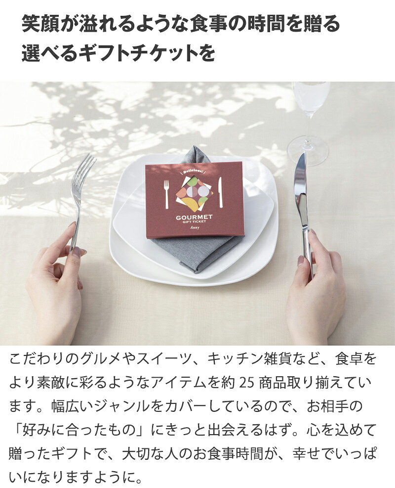 ▼お問い合わせ前にご確認ください▼ Powered by EC-UPさまざまなギフトや記念品をご用意しております ■お祝いのお品として 内祝 内祝い お祝い返し ウェディングギフト ブライダルギフト 引き出物 引出物 結婚引き出物 結婚引出物 結婚内祝い 出産内祝い 命名内祝い 入園内祝い 入学内祝い 卒園内祝い 卒業内祝い 就職内祝い 新築内祝い 引越し内祝い 快気内祝い 開店内祝い 二次会 披露宴 お祝い 御祝 結婚式 結婚祝い 出産祝い 初節句 七五三 入園祝い 入学祝い 卒園祝い 卒業祝い 入社祝い 入社式 昇進祝い 昇給祝い 成人式 就職祝い 昇進祝い 新築祝い 上棟祝い 引っ越し祝い 引越し祝い 開店祝い 退職祝い 快気祝い 全快祝い 初老祝い 還暦祝い 古希祝い 古稀祝い 喜寿祝い 傘寿祝い 米寿祝い 卒寿祝い 白寿祝い 還暦 古稀 古希 喜寿 傘寿 米寿 卒寿 白寿 長寿祝い 金婚式 銀婚式 ダイヤモンド婚式 結婚記念日 ギフト ギフトセット セット 詰め合わせ 贈答品 お返し お礼 御礼 ごあいさつ ご挨拶 御挨拶 プレゼント お餞別 引越し 引越しご挨拶 記念日 誕生日 父の日 母の日 敬老の日 記念品 卒業記念品 定年退職記念品 ゴルフコンペ コンペ景品 景品 賞品 お中元 御中元 お歳暮 御歳暮 お年賀 御年賀 残暑見舞い 年始挨拶 話題 のし無料 メッセージカード無料 ラッピング無料 手提げ袋 大量注文 大口注文 ■このような方への贈り物として 父 母 父親 母親 ちち はは お父さん お母さん 両親 親戚 家族 兄弟 姉妹 兄 弟 姉 妹 義父 義母 祖父 祖母 曽祖父 曾祖母 叔父 叔母 おじいちゃん おばあちゃん 友人 友達 友だち 男友だち 女友だち 男友達 女友達 男子 女子 親友 同級生 旦那さん 奥さん 夫 妻 彼氏 彼女 先生 生徒 同僚 上司 取引先 部下 先輩 後輩 20代 30代 40代 50代 60代 70代 80代 ■このようなシーンの記念品として 保育園 幼稚園 学校 小学校 中学校 高校 高等学校 専門学校 専門 大学 大学院 研究室 部活 クラブ クラブチーム サークル 野球 サッカー バスケットボール バスケ バレーボール バレー テニス バドミントン バド 卓球 剣道 柔道 陸上 吹奏楽 オーケストラ 演劇 書道 美術 クラス クラスメート クラスメイト商品名 Anny 【選べる】贅沢グルメギフト チケット -DELICIOUS- セット内容 ・カタログチケット(チケット、ガイドブック) ・選べるギフト サイズ 高さ15mm×幅120mm×奥行90mm チケット使用期限 購入日から6ヵ月 ※期限までにサービスを受けていただく必要があります。
